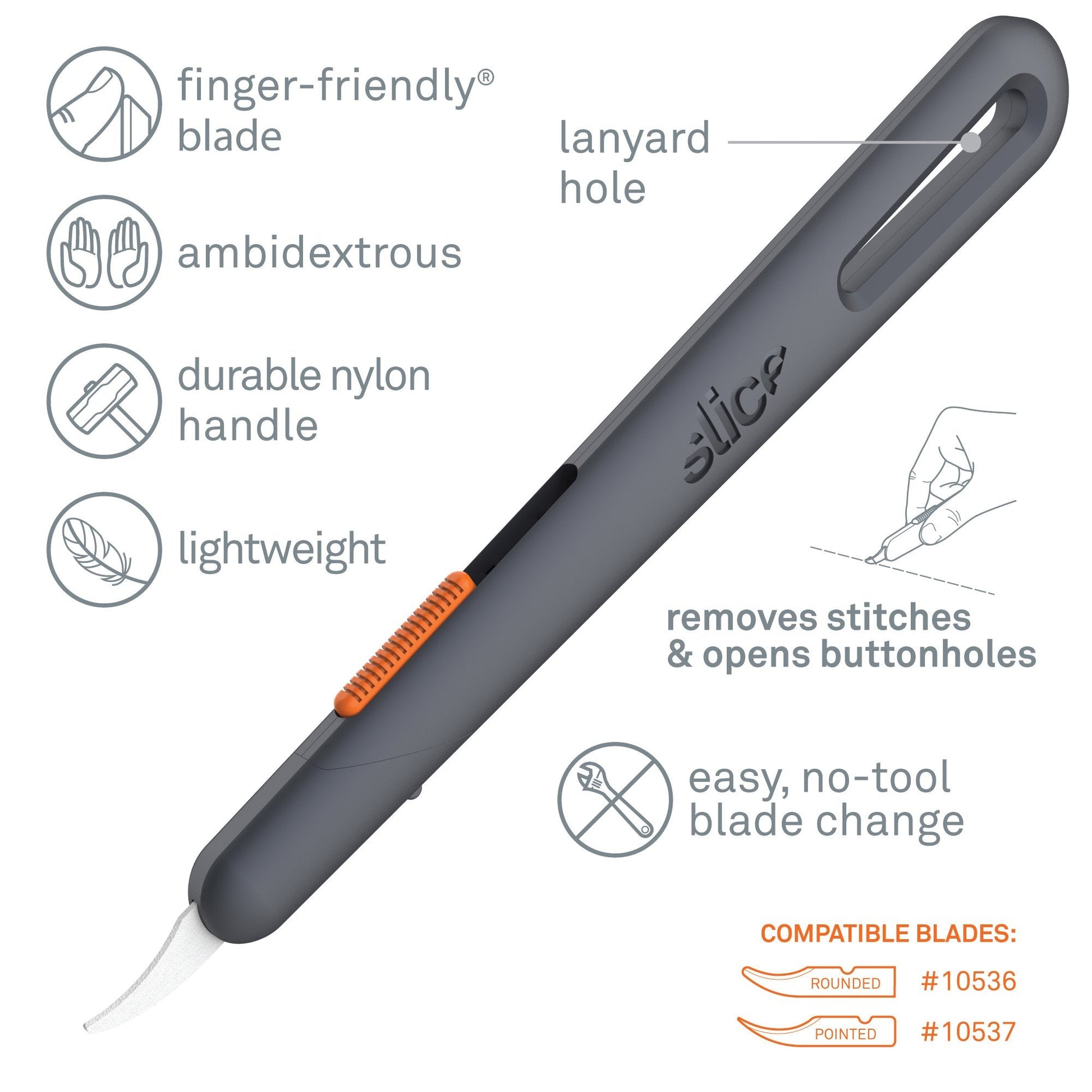 Our 10596 and 10597 tools come with a rounded-tip 10536 blade installed, providing extra protection against accidental punctures. For those who prefer, a 10537 pointed-tip blade is available separately. Both blades are concave, with a tapered tip that slides between stitches and cuts thread easily without pulling on delicate surrounding fabric. In this way, the seam can be replaced without leaving unsightly gaps where the old stitches once were.