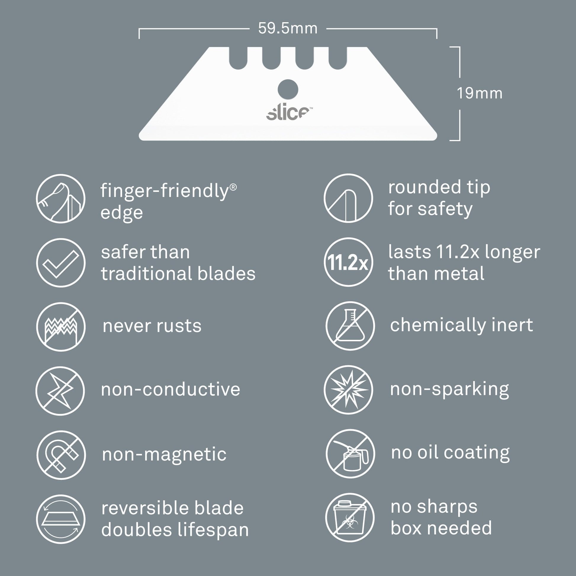 Keramické trapézové čepele Slice® 10524 jsou vhodné pro naše univerzální nože s kovovou rukojetí - 10490 a 10491. Čepele 10524 jsou vyrobeny z pokrokové keramiky a jsou nejiskřivé, nemagnetické, chemicky netečné, nepodléhají korozi a nepotřebují mazání. Díky složení ze 100% oxidu zirkoničitého a odolnému finger-friendly® designu si tyto čepele poradí s obtížnými materiály a jsou mimořádně voděodolné. Vydrží dokonce až 11krát déle než ocelové čepele. Jejich unikátní bezpečnostní hrana navíc pomáhá omezit zranění a snížit náklady.