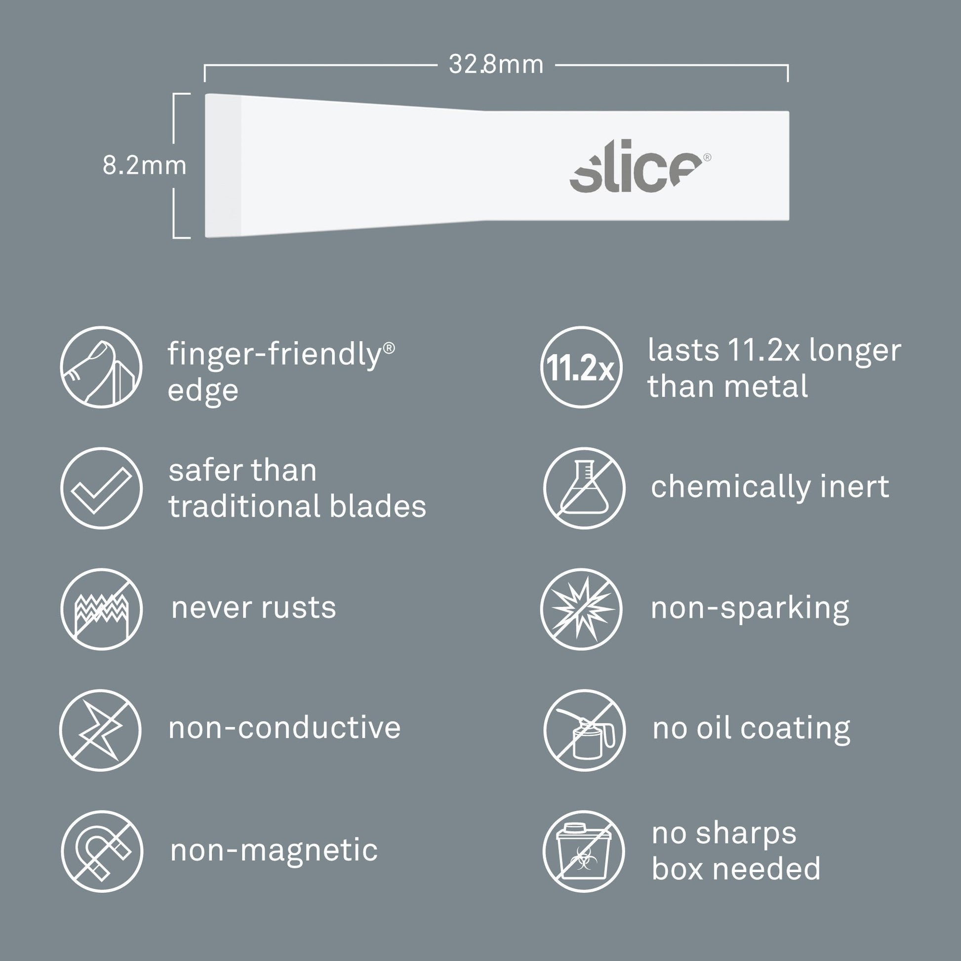 Sekací čepele Slice® 10534 mají stabilní, přesné a bezpečné ostří díky našemu finger-friendly® zbroušení a extrémně silnému oxidu zirkoničitému. Perfektně se hodí pro detailní práce a jsou kompatibilní s rukojeťmi většiny skalpelů a modelářských nožů Slice. Protože jsou tyto čepele chemicky netečné, nevodivé a vydrží v autoklávu, jsou skvělou volbou pro výrobce elektroniky nebo pro práci v laboratoři. Stejně jako všechna bezpečnostní keramika Slice jsou tyto čepele bezpečné na dotyk a vydrží až jedenáctkrát déle než kovové čepele.