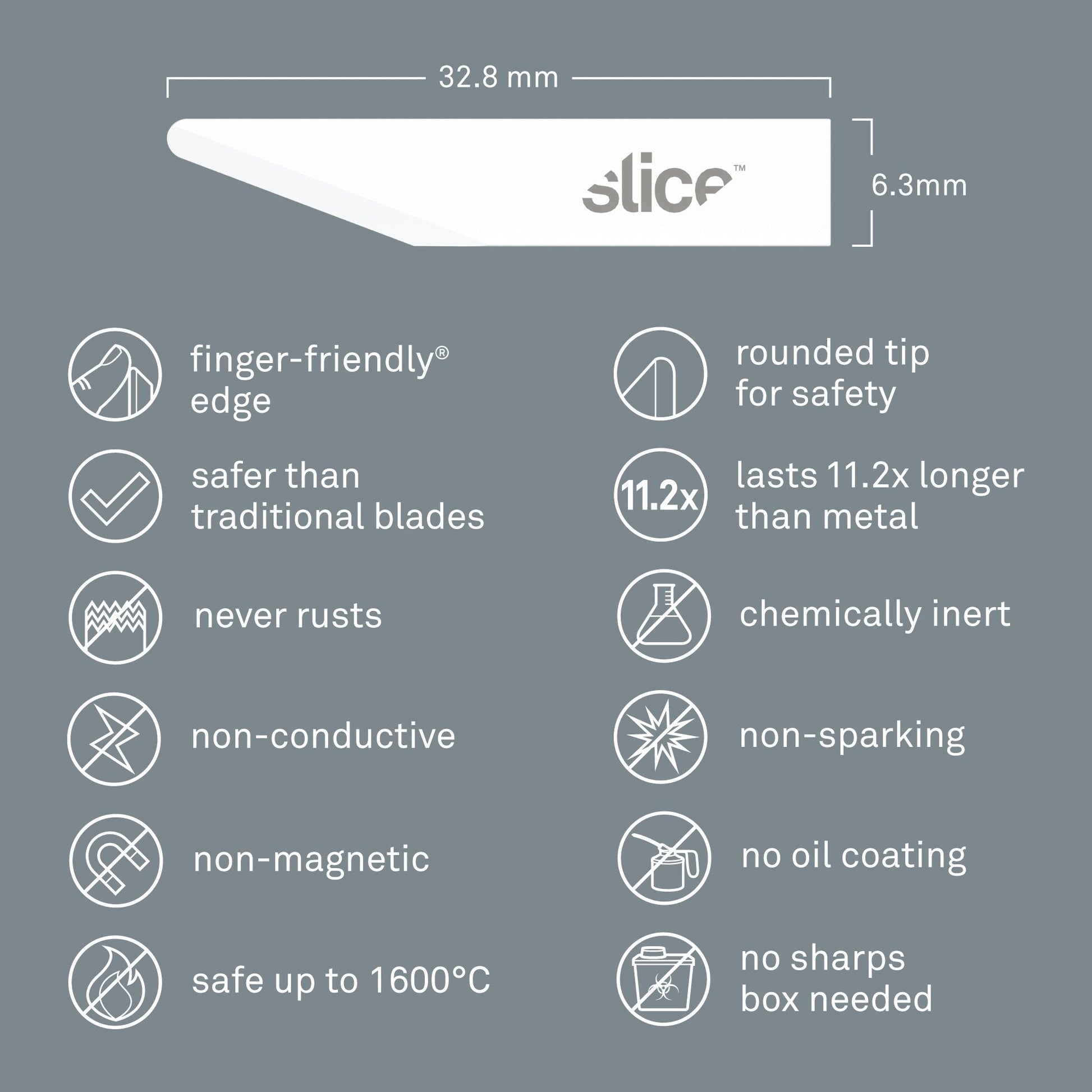 Čepele Slice® 10518 do modelářských nožů jsou kompatibilní s rukojeťmi našich modelářských nožů a skalpelů. Umožňují složité detailní řezy a pyšní se mnohem bezpečnějším finger-friendly® ostřím. Na rozdíl od běžných kovových či keramických čepelí do modelářských nožů mají tyto rovné čepele se zaoblenou špičkou naši unikátní bezpečnostní hranu. Kromě toho jejich ostrost vydrží až jedenáctkrát déle než kov, nevyžadují sběrné boxy k likvidaci a jsou recyklovatelné. Stejně jako všechna bezpečnostní keramika Slice jsou tyto čepele nejiskřivé, nemagnetické, chemicky netečné a nepodléhají korozi.