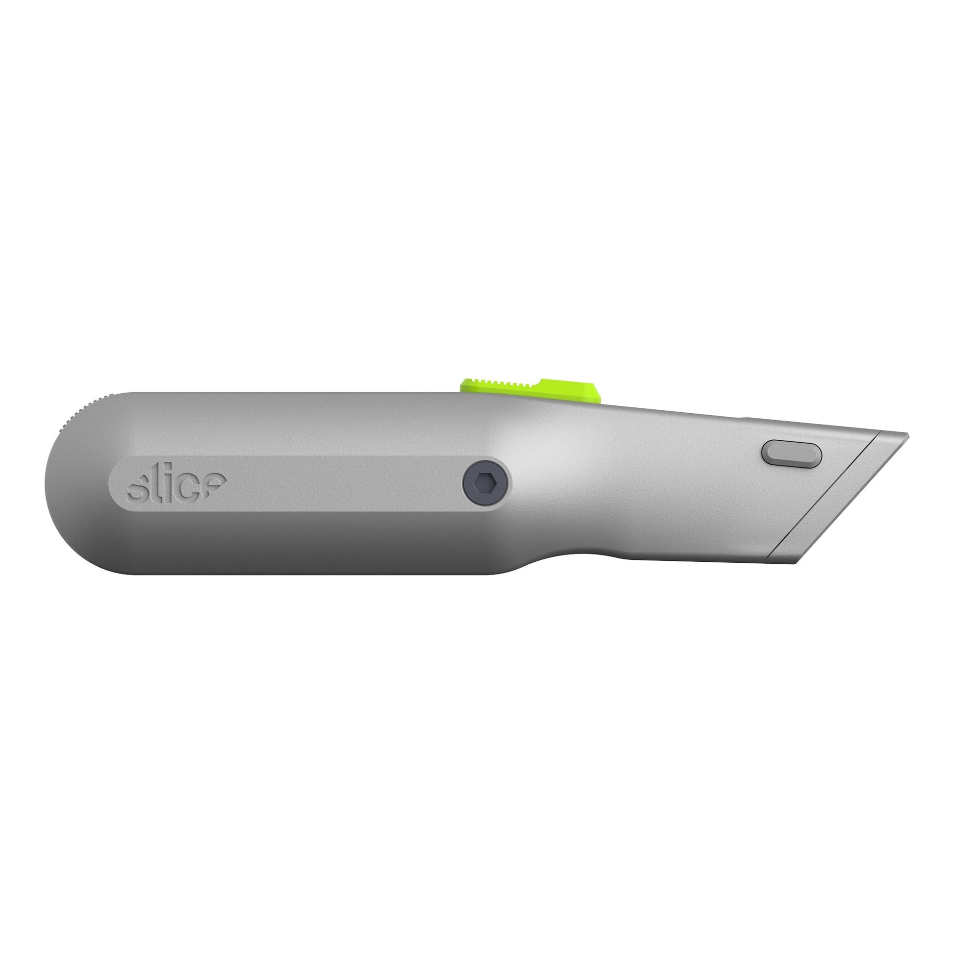 Samozatahovací univerzální nůž Slice® 10491 s kovovou rukojetí je bezpečný a výkonný: dokonalý nástroj, který minimalizuje poranění bez dopadu na efektivitu práce. Čepel tohoto nože je nejbezpečnější, jakou na vašem pracovišti můžete mít. Jeho unikátní finger-friendly® čepel je bezpečná na dotyk, a proto způsobuje mnohem méně (a mnohem méně závažných) zranění než všechny tradiční čepele. Automatické zatahování poskytuje další úroveň bezpečnosti, neboť díky němu čepel nikdy nezůstane náhodně vytažená. Tento univerzální nůž s kvalitami pro průmyslové použití má odolnou kovovou rukojeť, která se pohodlně drží a je vhodná pro praváky i leváky. Díky snadné výměně čepele bez nářadí a vestavěnému úložišti na náhradní čepele v rukojeti budou vaši zaměstnanci pracovat efektivněji než kdy předtím.