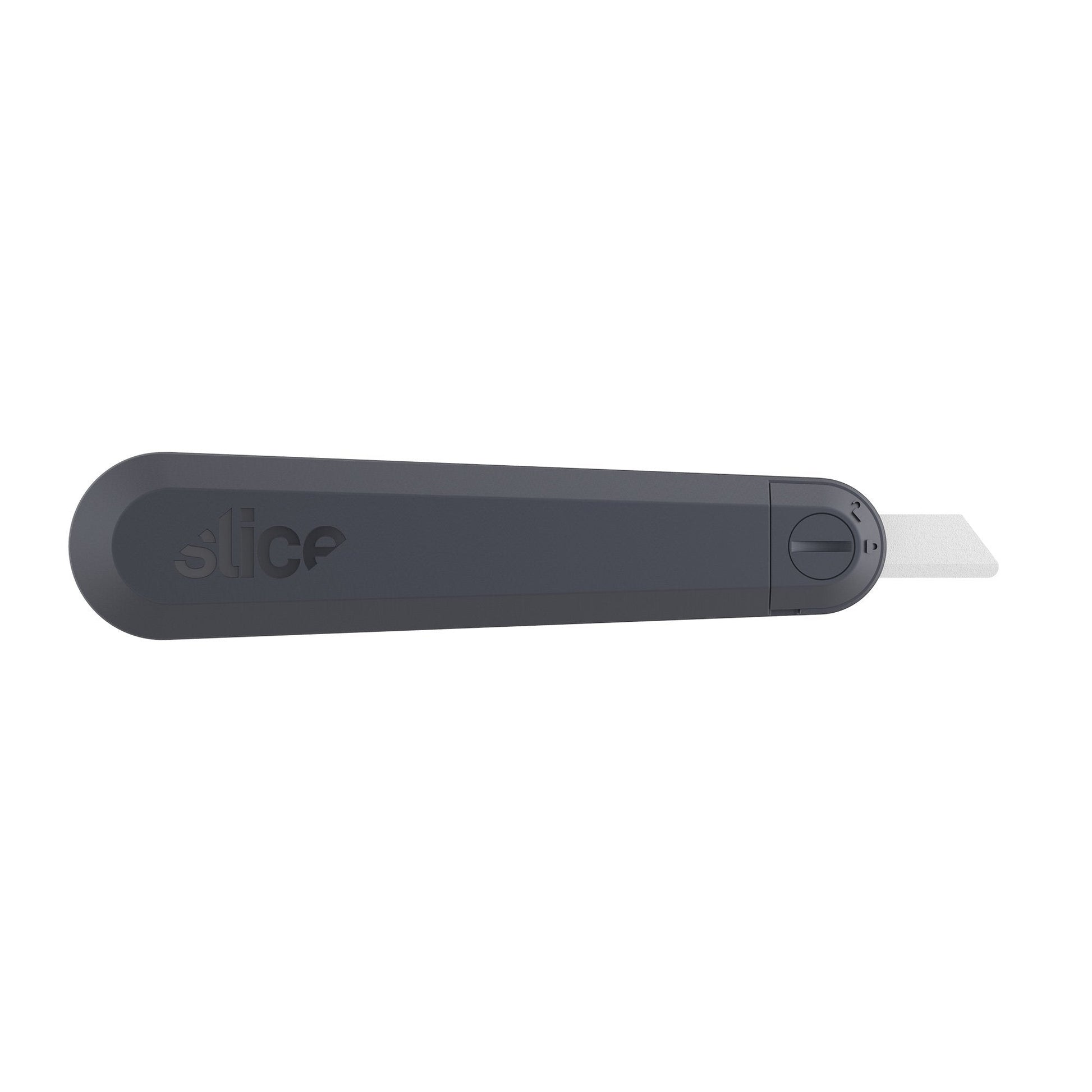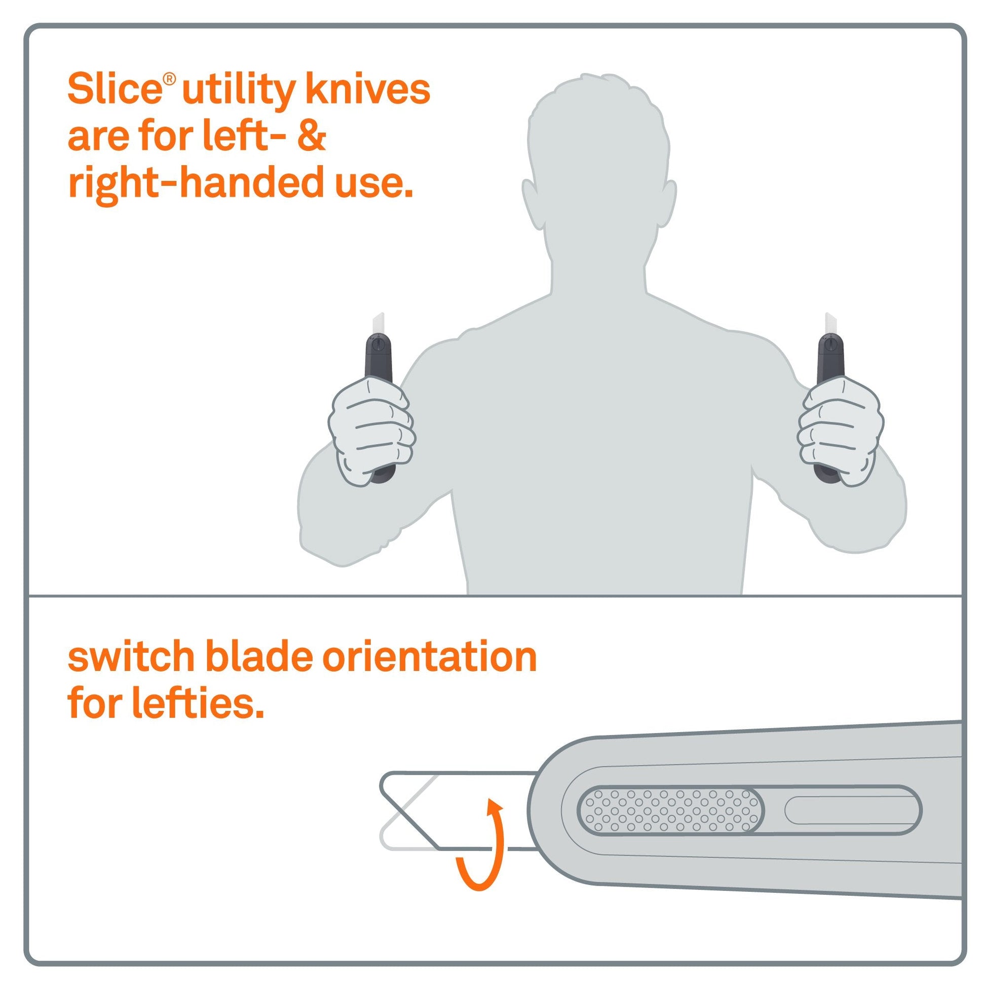 Slice utility knife blades can handle the same materials as steel utility knives. Our utility knives are compatible with two different blade-tip styles: rounded and pointed. Both styles are 24 mm long, allowing you to cut through thick materials like triple-walled corrugated. The 10554 ships with the 10526 rounded blade. For most applications, the rounded tip is safer. However, when you need to initiate your cut with a piercing action, such as with plastic wrap, plastic banding, fabric, or drywall, we recommend the 10528 pointed-tip blade.