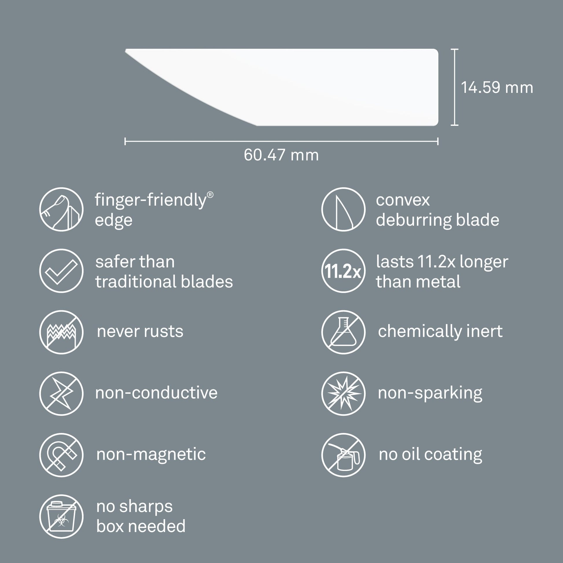 Doručte svým zákazníkům dokonale hladké výrobky a součástky díky odolným konvexním odhrotovacím čepelím Slice® 10483. Tato tlustá odhrotovací čepel je navržena k průmyslovému použití a zcela bez problému odstraní otřepy a další povrchové vady z materiálů, jako jsou surové plechy či vstřikované plasty. Tato konvexní čepel je vyrobena ze 100% oxidu zirkoničitého - druhu keramiky, který je mnohem tvrdší než ocel. Představuje mnohem odolnější alternativu k tradičním odhrotovacím čepelím z oceli, neboť vydrží až jedenáctkrát déle než kovové čepele a nemusí být tak často měněna. Čepel 10483 je kompletně od základů navržena pro náš odhrotovač Slice 10482. Je chemicky netečná, nepodléhá korozi a nevyžaduje žádnou speciální údržbu, aby si zachovala svou účinnost.